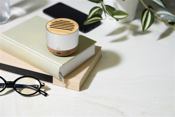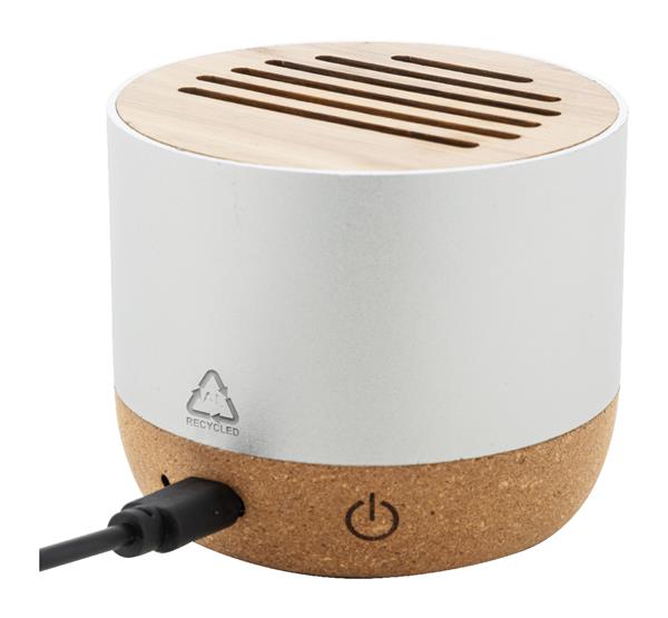 Głośnik bezprzewodowy w obudowie z recyklingowanego aluminium, z siatką bambusową i podstawą z naturalnego korka. Z akumulatorem (400 mAh). W zestawie kabel USB do ładowania.