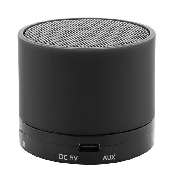 Głośnik bezprzewodowy z recyklingowanego ABS w gumowanej obudowie z metalową siatką i akumulatorem (300 mAh). Z funkcją głośnomówiącą i odtwarzaniem plików MP3 z karty micro SD. W zestawie kabel USB do ładowania.