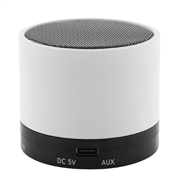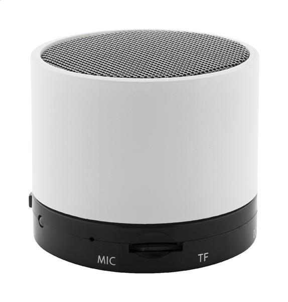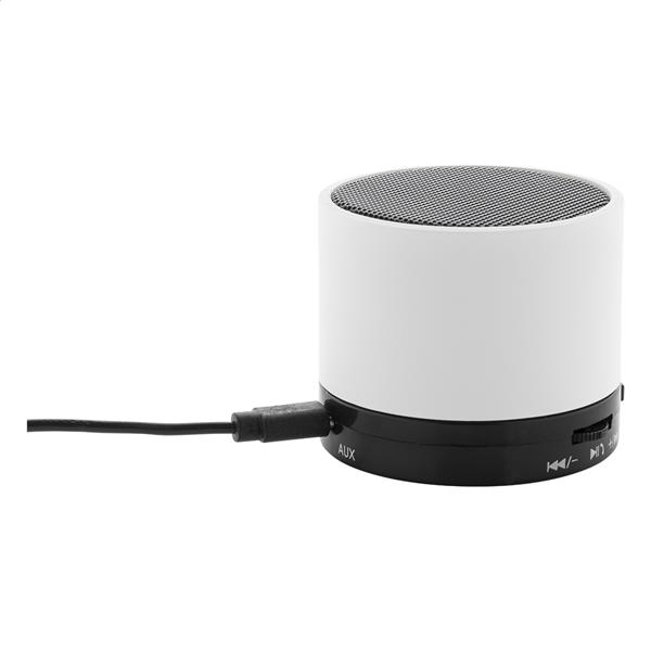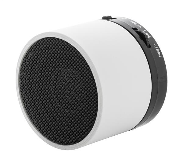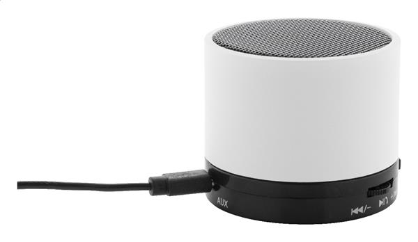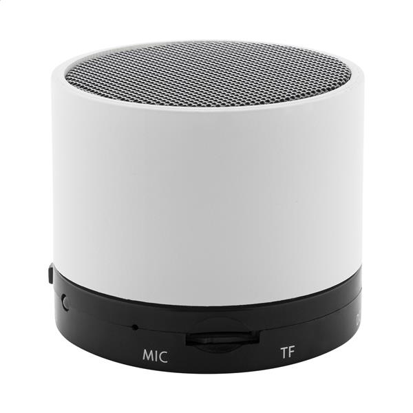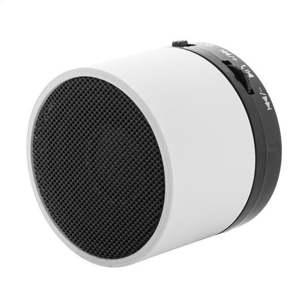 Głośnik bezprzewodowy z recyklingowanego ABS w gumowanej obudowie z metalową siatką i akumulatorem (300 mAh). Z funkcją głośnomówiącą i odtwarzaniem plików MP3 z karty micro SD. W zestawie kabel USB do ładowania.
