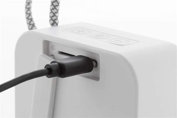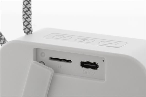 Głośnik bezprzewodowy z recyklingowanego ABS z paskiem do noszenia, metalową siateczką i akumulatorem (300 mAh). Z funkcją odtwarzania plików MP3 z karty micro SD. W zestawie kabel USB do ładowania.