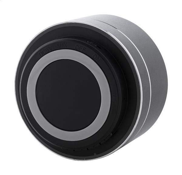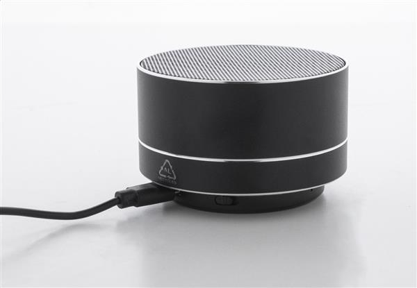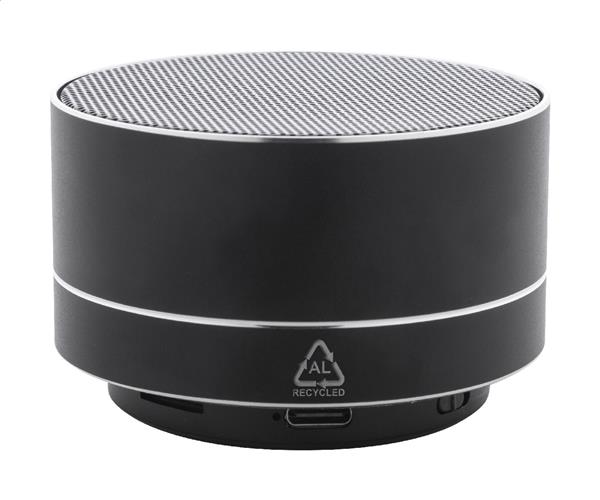 Głośnik bezprzewodowy z recyklingowanego aluminium z metalową siateczką, diodą LED na spodzie i akumulatorem (300 mAh). Z funkcją głośnomówiącą i odtwarzaniem plików MP3 z karty micro SD. W zestawie kabel USB do ładowania.