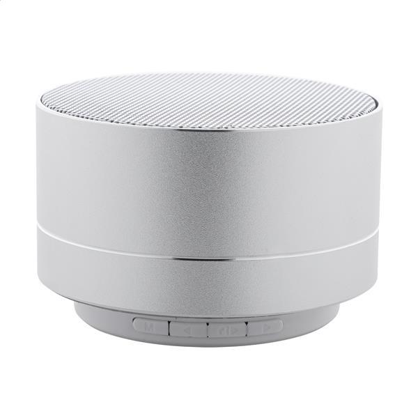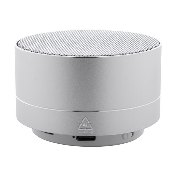 Głośnik bezprzewodowy z recyklingowanego aluminium z metalową siateczką, diodą LED na spodzie i akumulatorem (300 mAh). Z funkcją głośnomówiącą i odtwarzaniem plików MP3 z karty micro SD. W zestawie kabel USB do ładowania.