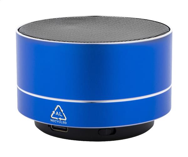 Głośnik bezprzewodowy z recyklingowanego aluminium z metalową siateczką, diodą LED na spodzie i akumulatorem (300 mAh). Z funkcją głośnomówiącą i odtwarzaniem plików MP3 z karty micro SD. W zestawie kabel USB do ładowania.