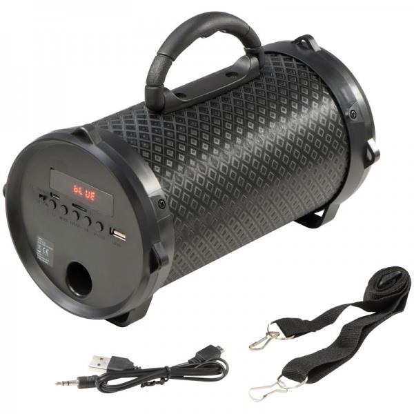 Plastikowy, czarny głośnik z funkcją Bluetooth, wbudowanym radiem i zasięgiem do 10 m, wraz z kabelem USB.