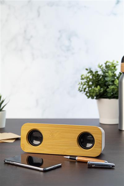 Bezprzewodowy głośnik w obudowie z recyklingowanego ABS i bambusa z 2 przetwornikami i wbudowanym akumulatorem. Z funkcją głośnomówiącą i radiem FM. W zestawie kabel USB do ładowania.