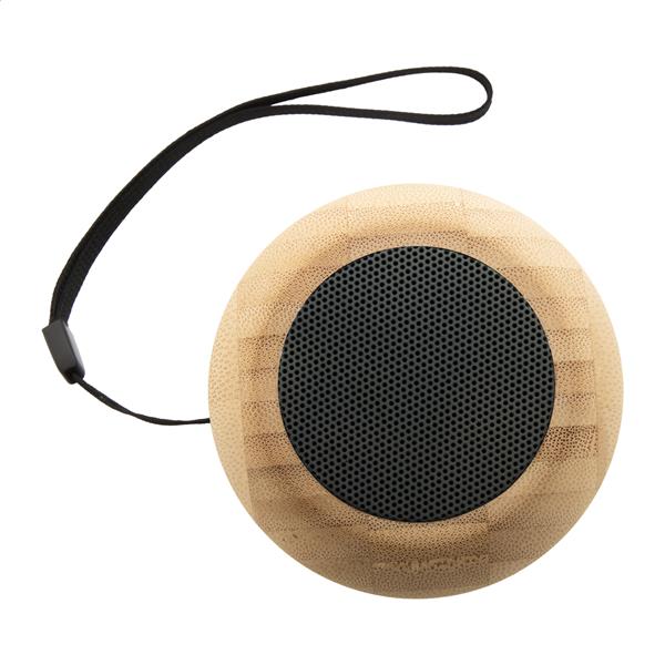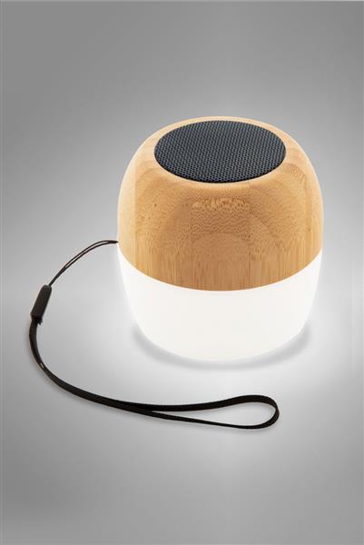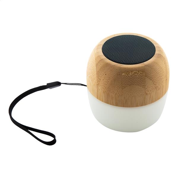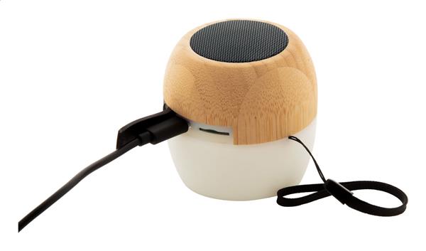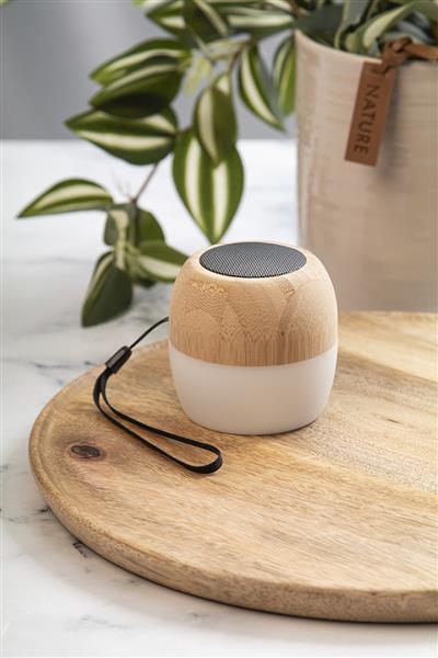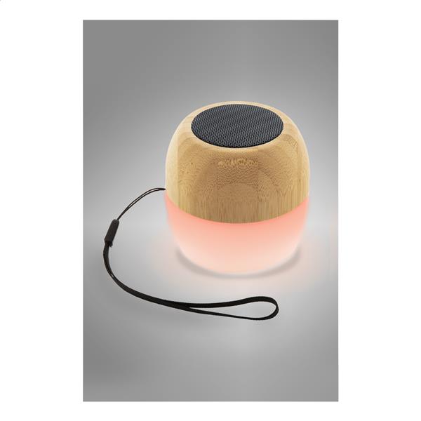 Bezprzewodowy głośnik w obudowie z recyklingowanego plastiku ABS i bambusa z wielokolorowym światłem LED na dole. Z paskiem do przenoszenia i wbudowanym akumulatorem. W zestawie kabel USB do ładowania.