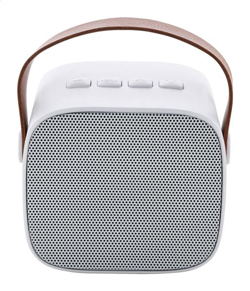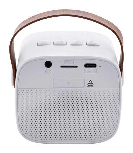Bezprzewodowy głośnik z recyklingowanego tworzywa ABS z paskiem ze skóry PU i wbudowanym akumulatorem (1200 mAh). W zestawie kabel USB do ładowania.