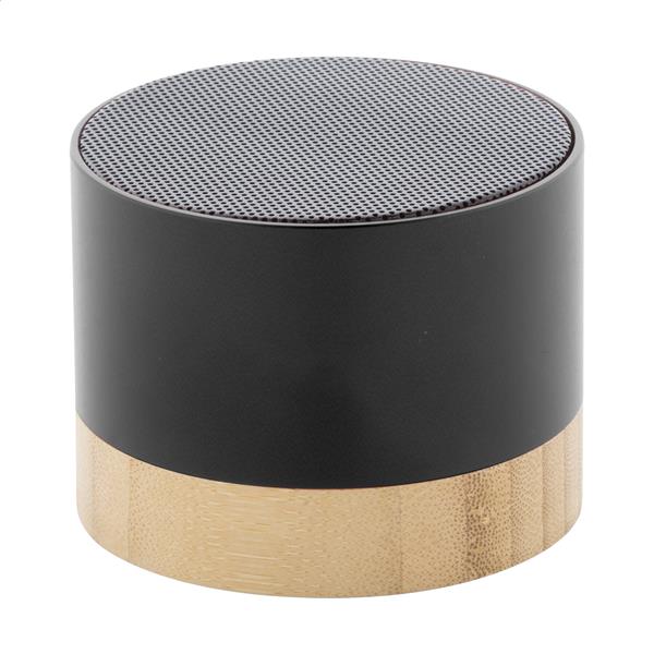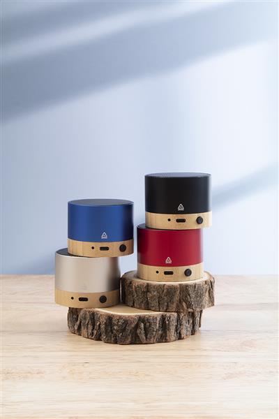 Bezprzewodowy głośnik z aluminium pochodzącego z recyklingu i bambusową podstawą. Z funkcją głośnomówiącą i wbudowanym akumulatorem. W zestawie kabel USB do ładowania.