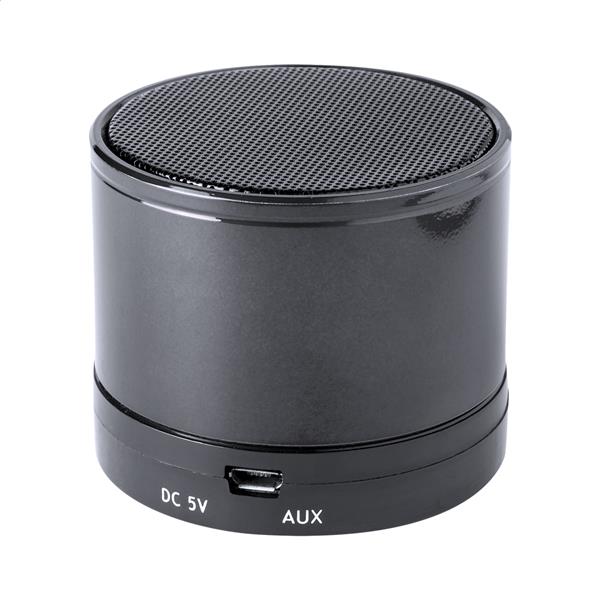 Bezprzewodowy głośnik w obudowie z recyklingowanego aluminium i ABS. Z radiem, odtwarzaczem MP3, funkcją głośnomówiącą i wbudowanym akumulatorem (300 mAh). W zestawie ładowarka USB i kabel aux-in.