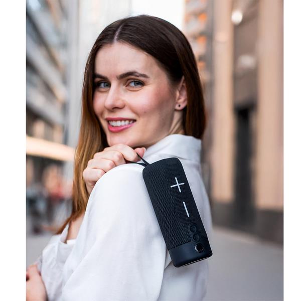 Stylowy głośnik w technologii Bluetooth V5.3 zapewniający najwyższą jakość dźwięku. Wbudowane radio FM i przyciski sterujące odtwarzaniem dźwięku. Wyposażony w funkcję odbierania połączeń telefonicznych hands-free call, porty na kartę micro SD, USB. Moc wyjściowa: 5W*2. Wbudowany akumulator litowo-jonowy o pojemności 1200 mAh. Pasmo przenoszenia: 120Hz-80 KHz. Ładowanie: DC 5V micro USB (kabel w zestawie). Czas ładowania: 1.5 do 2 godzin. Czas odtwarzania do 2 godzin. Zasięg do 10m.