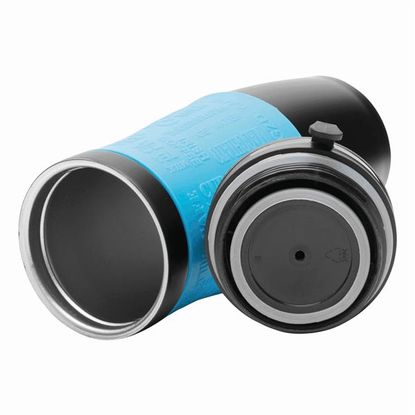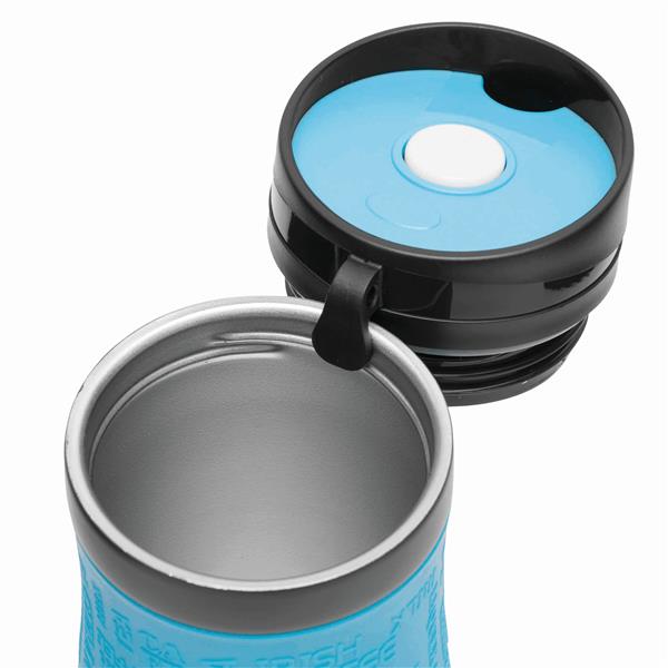 Kubek termiczny GOLDEN DREAM wewnątrz i na zewnątrz ze stali nierdzewnej. Plastikowe odkręcane wieczko, przesuwane zamknięcie wbudowanego otworu do picia, w wieczku wbudowany haczyk do zawieszania, kolorowa, gumowana, silikonowa nakładka dla lepszej przyczepności, ok. 380 ml pojemności, pakowany w pudełko. Materiał: Stal nierdzewna/Silikon/Plastik Kolor: czarny, jasnoniebieski Tagi: Kubki,filiżanki,przybory kuchenne,artykuły gospodarstwa domowego,kubki/garnki termiczne,akcesoria podróżne,kubki do kawy