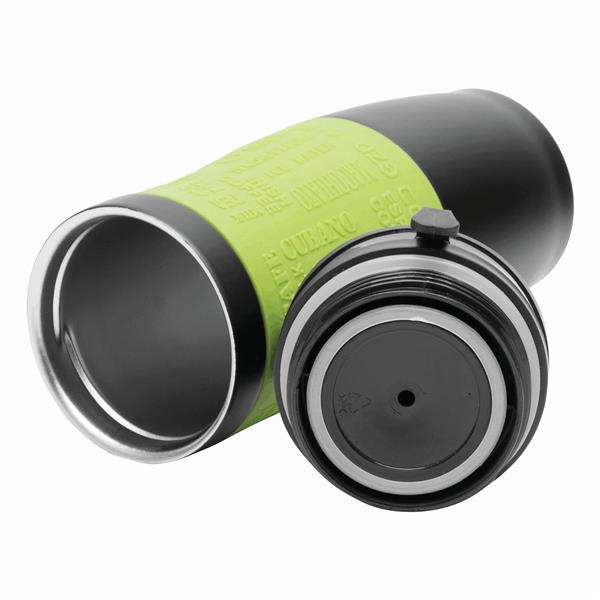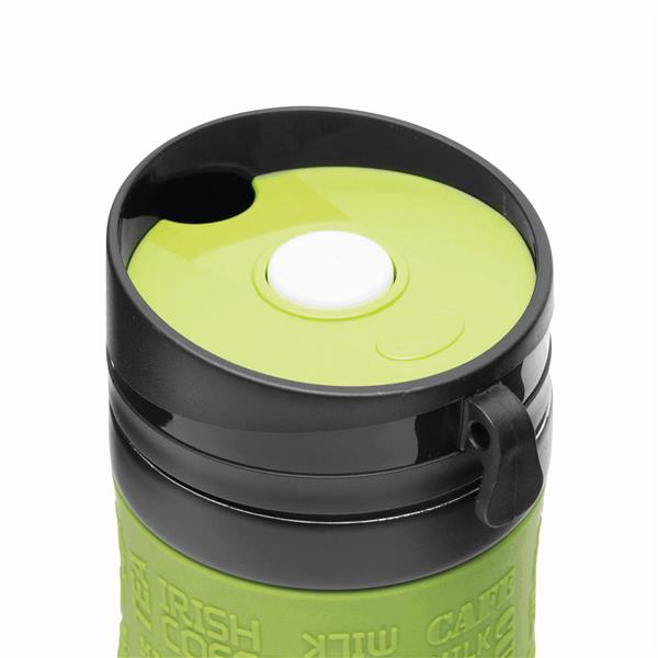 Kubek termiczny GOLDEN DREAM wewnątrz i na zewnątrz ze stali nierdzewnej. Plastikowe odkręcane wieczko, przesuwane zamknięcie wbudowanego otworu do picia, w wieczku wbudowany haczyk do zawieszania, kolorowa, gumowana, silikonowa nakładka dla lepszej przyczepności, ok. 380 ml pojemności, pakowany w pudełko. Materiał: Stal nierdzewna/Silikon/Plastik Kolor: czarny, jasnozielony Tagi: Kubki,filiżanki,przybory kuchenne,artykuły gospodarstwa domowego,kubki/garnki termiczne,akcesoria podróżne,kubki do kawy