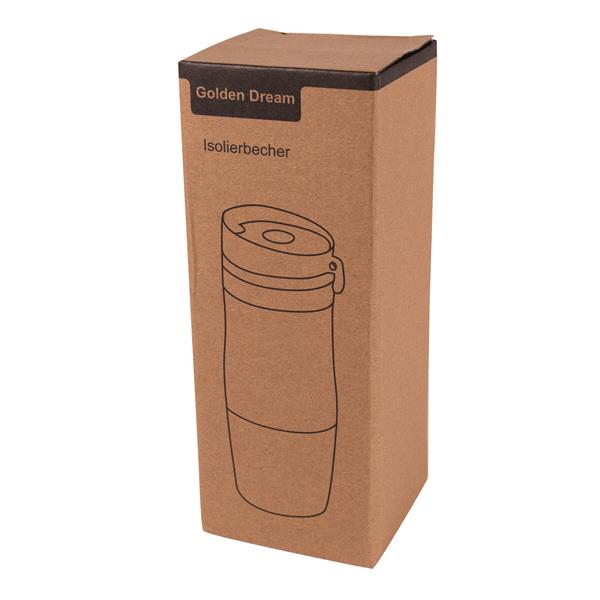 Kubek termiczny GOLDEN DREAM wewnątrz i na zewnątrz ze stali nierdzewnej. Plastikowe odkręcane wieczko, przesuwane zamknięcie wbudowanego otworu do picia, w wieczku wbudowany haczyk do zawieszania, kolorowa, gumowana, silikonowa nakładka dla lepszej przyczepności, ok. 380 ml pojemności, pakowany w pudełko.