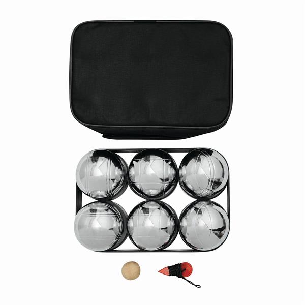 Zestaw do gry w boule GOLIATH składa się z 6 metalowych kul, drewnianej piłeczki i czerwonego sznurka. Pakowany w czarne nylonowe etui z zamkiem.