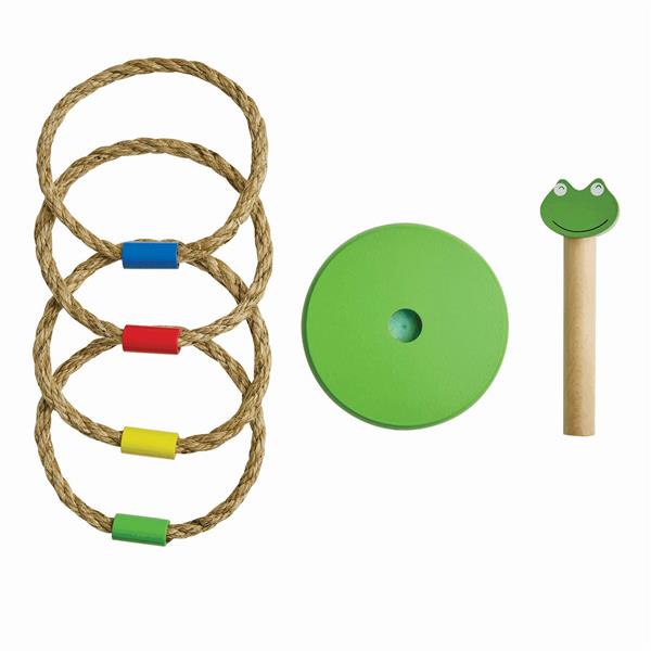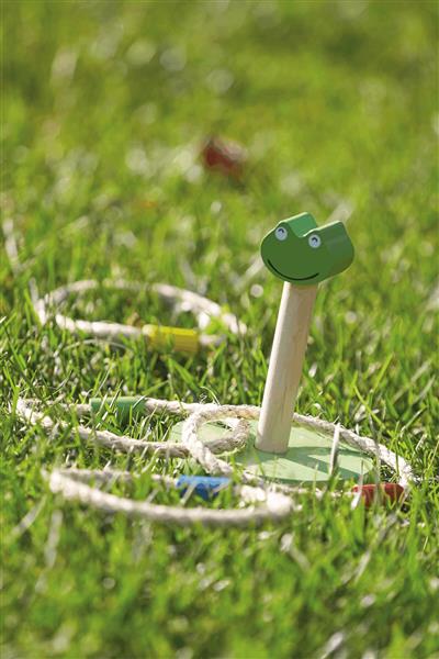 Gra CRAZY LOOP wykonana z drewna, w kształcie żaby. W zestawie 4 pętle do zarzucania ze sznurka, z drewnianymi znacznikami w różnych kolorach.