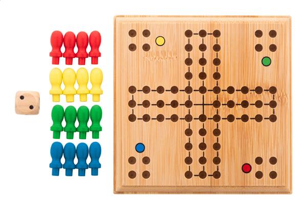 Bambusowa gra Ludo w bawełnianym etui ze sznurkiem. Description: Bambusowa gra Ludo w bawełnianym etui ze sznurkiem. Primary Color: naturalny Gramatura 2: 200 g/m2 Material 1: Bambus Material 2: Bawełna Rozmiar: 140×160 mm