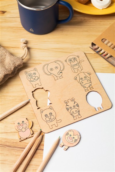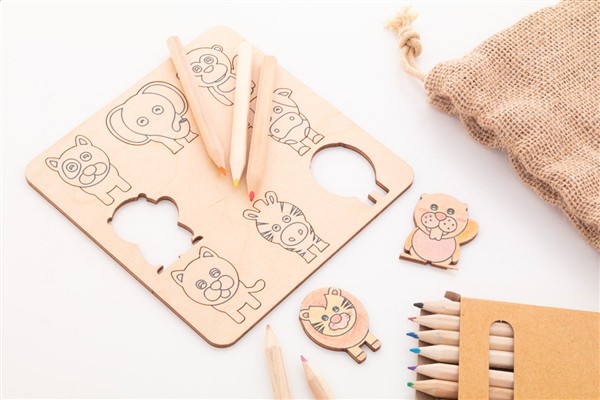 Gra polegająca na dopasowywaniu kształtów do kolorowanek, wykonana ze sklejki brzozowej, w jutowym woreczku. Zawiera tematyczne wycięte figurki (8 szt.) i drewniane kredki (12 szt.) w papierowym pudełku.