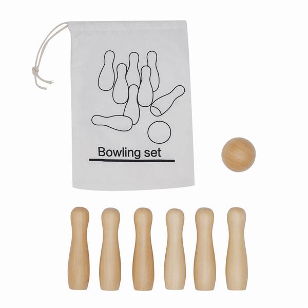 Gra w kręgle FIRST STRIKE. 6 drewnianych kręgli i 1 kula w ekologicznej, bawełnianej torbie.