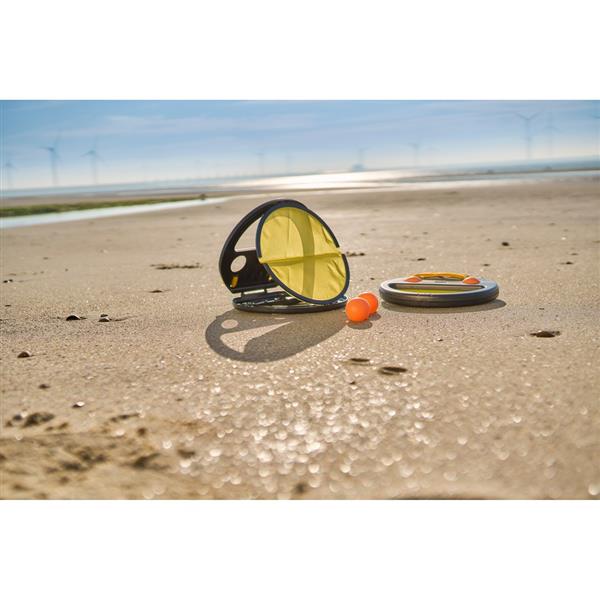 Gra zręcznościowa, zawierająca dwa uchwyty i po dwie piłki na każdy uchwyt, posiada funkcję blokady, która utrzymuje uchwyty zamknięte, paski na rzepy po bokach do przymocowania uchwytów do rąk, indywidualnie zapakowany w brązowe kartonowe pudełko, produkt wykonany z ABS