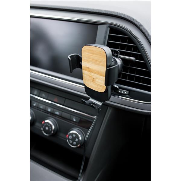 Grawitacyjny samochodowy uchwyt do telefonu z bambusowym elementem, ładowarka bezprzewodowa 15W, działa z telefonami posiadającymi możliwość ładowania indukcyjnego, mocowanie do wentylacji, wejście USB-C, 100 cm kabel USB-C w komplecie, produkt wykonany z ABS i bambusa