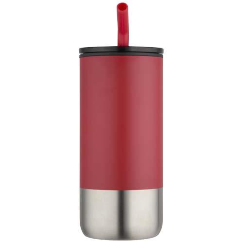 Ten kubek termiczny o podwójnych ściankach jest wyposażony w słomkę ze stali nierdzewnej z recyklingu, zakończoną silikonową końcówką zapewniającą wygodę użytkowania. Wewnętrzna ścianka jest wykonana z polipropylenu, a ścianka zewnętrzna ze stali nierdzewnej z recyklingu z certyfikatem RCS. Przesuwana pokrywa wykonana z tworzywa PS i plastiku ABS w połączeniu z matową powłoką nadaje kubkowi eleganckie wykończenie. Pojemność: 480 ml.
