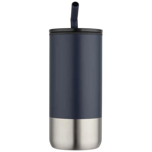 Ten kubek termiczny o podwójnych ściankach jest wyposażony w słomkę ze stali nierdzewnej z recyklingu, zakończoną silikonową końcówką zapewniającą wygodę użytkowania. Wewnętrzna ścianka jest wykonana z polipropylenu, a ścianka zewnętrzna ze stali nierdzewnej z recyklingu z certyfikatem RCS. Przesuwana pokrywa wykonana z tworzywa PS i plastiku ABS w połączeniu z matową powłoką nadaje kubkowi eleganckie wykończenie. Pojemność: 480 ml.