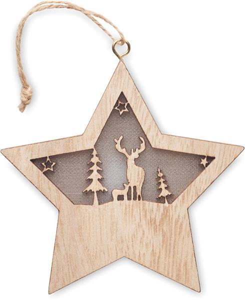 Gwiazda z płyty MDF z lampką w środku, z ozdobami świątecznymi i sznurkiem do zawieszania. Zawiera 3 baterie LR44.
