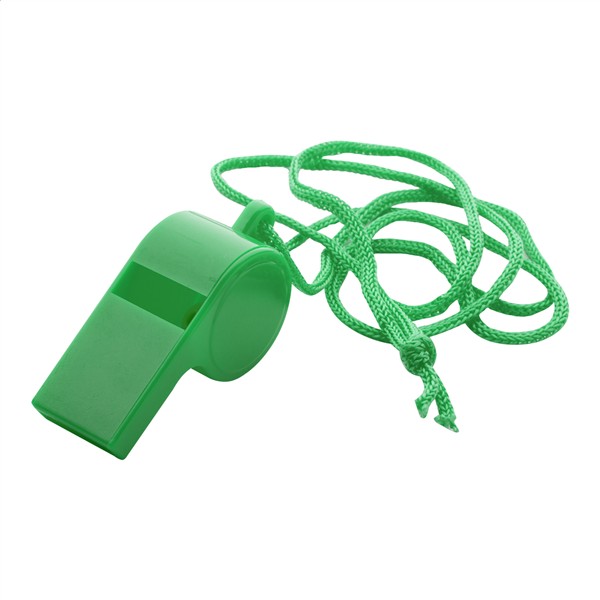 Plastikowy gwizdek ze smyczą w tym samym kolorze.