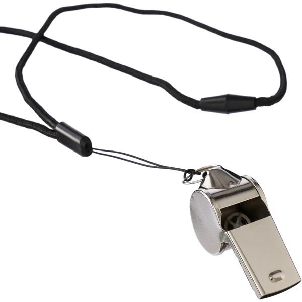 Gwizdek ze sznurkiem z poliestru, można go zawiesić na szyi albo wieszaku, wydaje głośny sygnał, zapakowany w brązowy kartonik, produkt wykonany z metalu