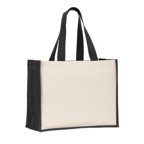 Torba płócienna (320 g/m2), z kolorowym laminowanym dnem i bokami z juty (350 g/m2). Posiada uchwyty o długości 60 cm. 420 x 330 x 190 mm
