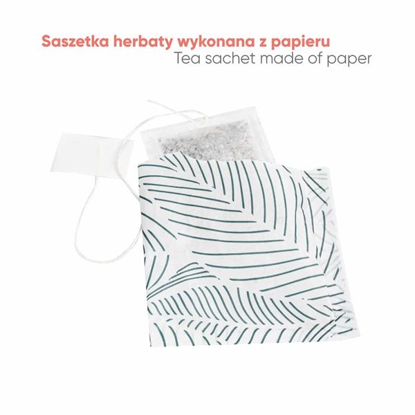 Każdą herbatę pakujemy w papierową saszetkę z nadrukowanym uniwersalnym wzorem. Jeśli jednak zamawiasz powyżej 2000 sztuk karnetów i zależy Ci na podwójnej personalizacji… to oferujemy nadruk Twojego indywidualnego projektu graficznego także na herbacianej saszetce.