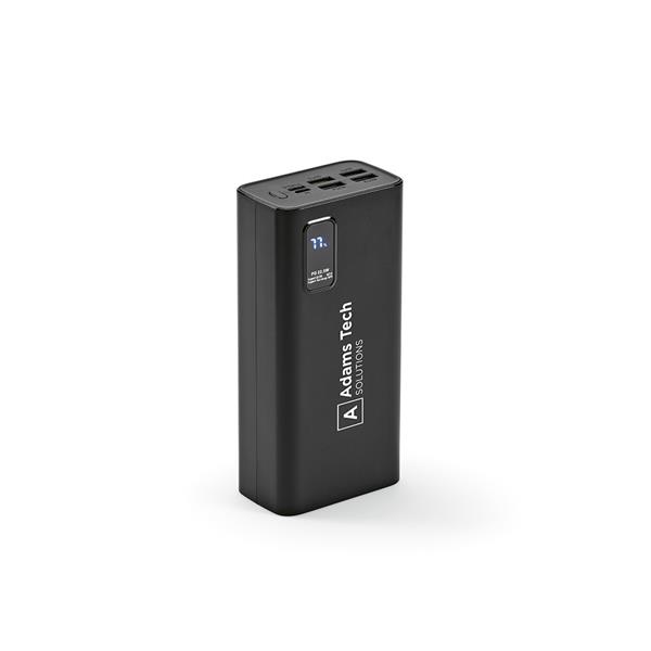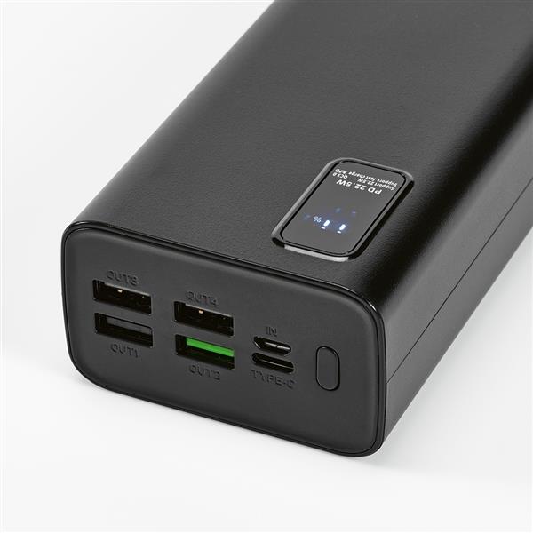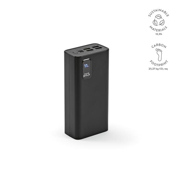 Trwała wytrzymałość dzięki recyklingowanego plastikowi ABS. Moc 30 000 mAh. Moc wyjściowa 22.5W. Podłącz przez USB-C i USB-A, dwukierunkowo. Wyświetlacz LED poprowadzi Cię przez podróż pełną energii. Połączenie eko-luksusu i mocy.