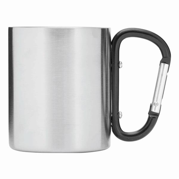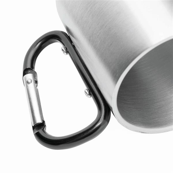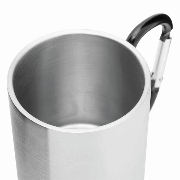 Kubek HIKING DAY ze stali nierdzewnej wewnątrz i na zewnątrz, pojemność ok. 200 ml, z kolorowym karabińczykiem.
