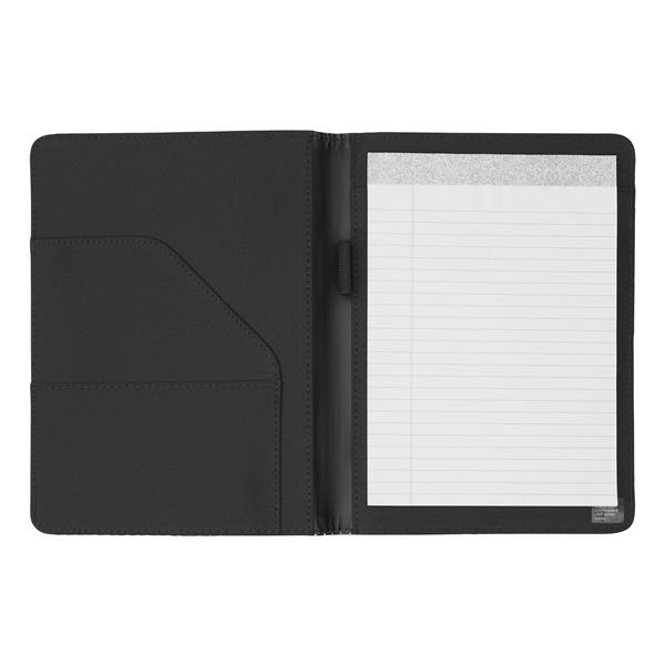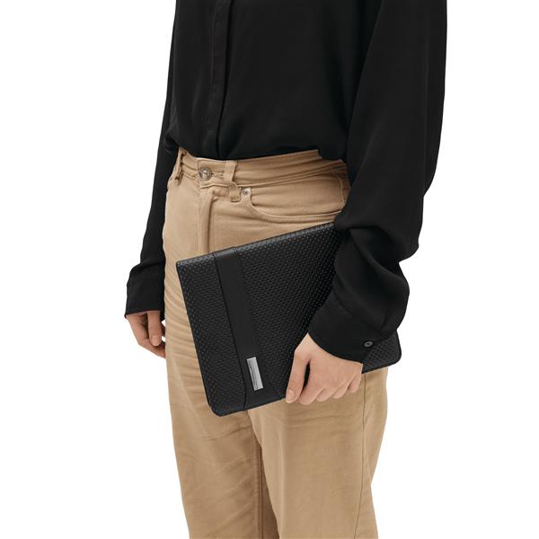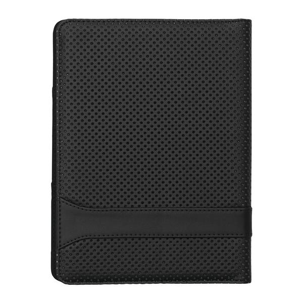 Portfolio HILL DALE w formacie A5, wewnątrz różne wsuwane kieszonki, zawiera notes w linie, pętelkę na długopis – na zewnątrz perforowany wzór, z metalową płytką na Twoje logo.