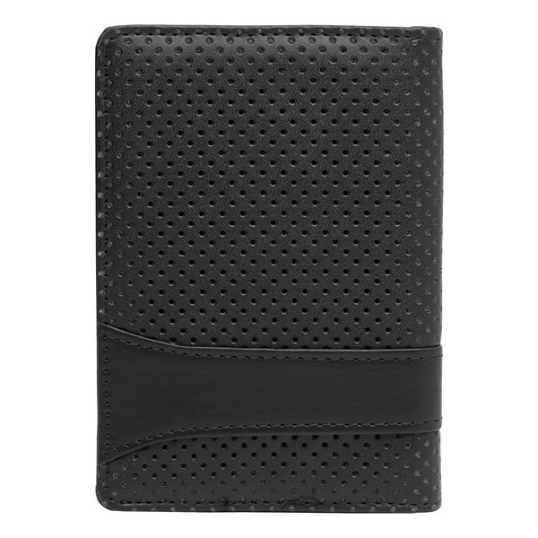 Etui na paszport HILL DALE, wsuwane kieszonki na karty kredytowe i przezroczysta kieszonka na paszport – na zewnątrz perforowany wzór, z metalową płytką na Twoje logo.