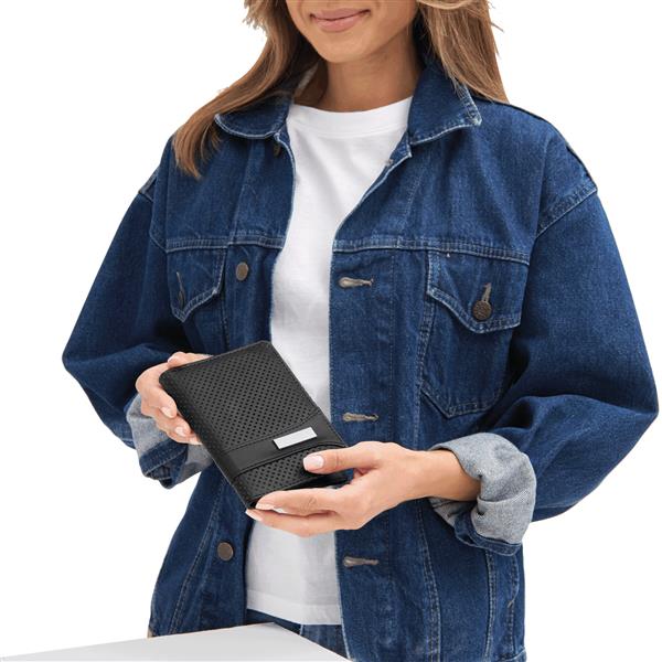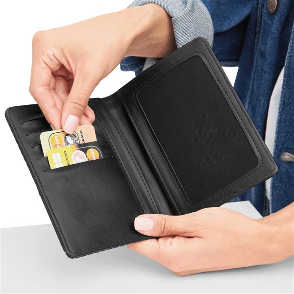 Etui na paszport HILL DALE, wsuwane kieszonki na karty kredytowe i przezroczysta kieszonka na paszport – na zewnątrz perforowany wzór, z metalową płytką na Twoje logo. Materiał: PU/PVC Kolor: czarny Tagi: akcesoria podróżne