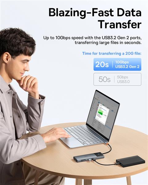 Czas to pieniądz, dlatego HUB zapewnia superszybki transfer danych, dzięki któremu przeniesiesz duże pliki w zaledwie kilka chwil. Niezależnie od tego, czy pracujesz nad projektami, oglądasz multimedia czy przesyłasz pliki.