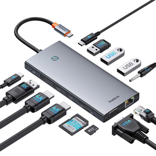 HUB Baseus PortalJoy Series 13w1 to prawdziwy przełom dla osób potrzebujących rozbudowanej przestrzeni roboczej. Możesz jednocześnie korzystać z czterech monitorów, co znacząco zwiększa efektywność pracy. HUB wyposażony jest w porty 2x HDMI, DisplayPort i VGA, które umożliwiają podłączenie różnych typów monitorów. Port DisplayPort obsługuje sygnał wideo w rozdzielczości 8K 30Hz i jest wstecznie kompatybilny z trybem 4K 120Hz, 4K 60Hz oraz 4K 30Hz na różne okazje. Przy podłączeniu urządzeń do portów wskaźnik poinformuje Cię, czy porty obsługują przesyłanie sygnału wideo. Gdy wskaźnik na obudowie świeci stałym światłem, oznacza to, że port obsługuje zarówno ładowanie i transfer danych, jak i wyjście wideo. Gdy wskaźnik miga, obsługiwane jest wyłącznie ładowanie i transfer danych. To idealne rozwiązanie dla grafików, programistów i osób pracujących z danymi, które potrzebują zaawansowanej konfiguracji monitorów do wykonywania swoich zadań na najwyższym poziomie.
