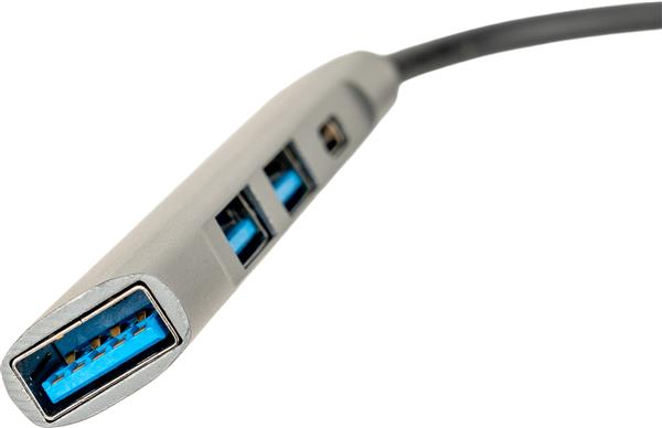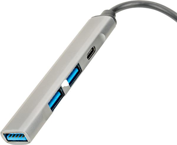 Rozgałęźnik HUB z funkcją transferu danych, wykonany z aluminium pochodzącego z recyklingu, z 3 wejściami USB, USB typu C oraz kablem na USB typu C. Moc wejściowa: 5.0V 500mA, moc wyjściowa: 5.0V 500mA