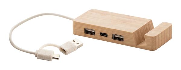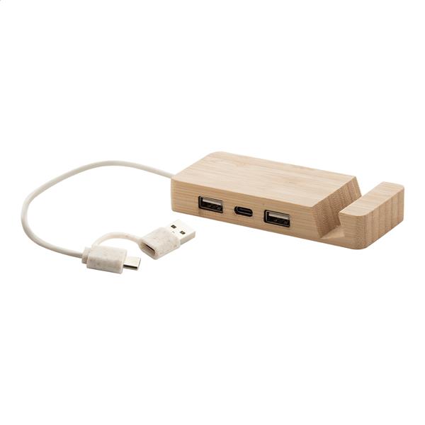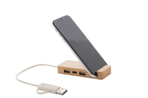 Bambusowy hub USB z funkcją uchwytu na telefon. Z 2 portami USB i 1 portem USB-C, USB 2.0. Zawiera kabel ze złączami USB i USB-C.