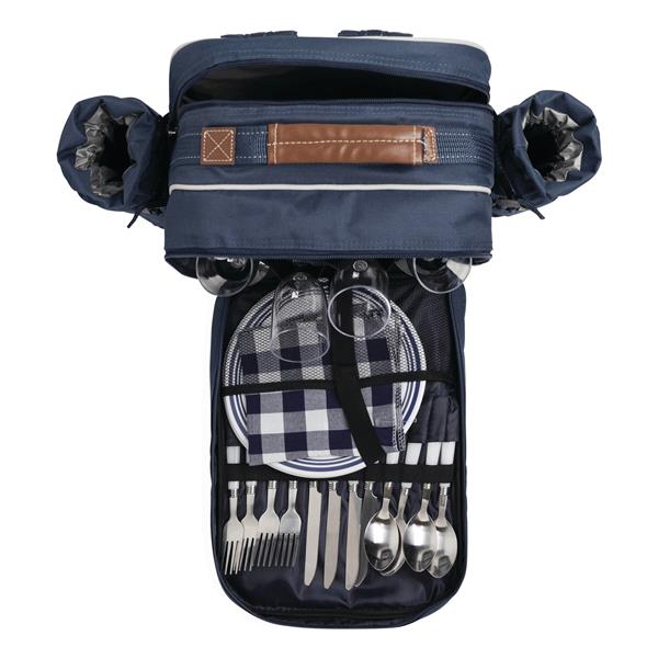Plecak piknikowy HYDE PARK dla 4 osób z wbudowaną torbą chłodzącą. Zawiera sztućce, plastikowe naczynia i kieliszki do wina, nóż do sera, otwieracz, serwetki z tkaniny, pojemnik na sól i pieprz oraz deskę do krojenia.