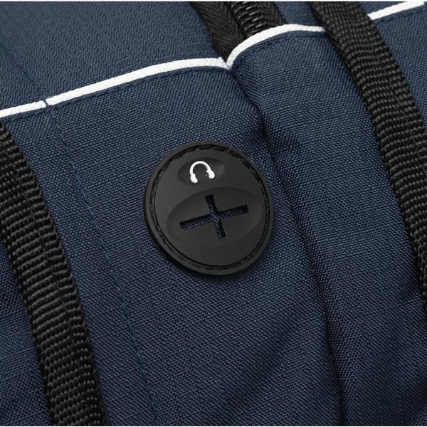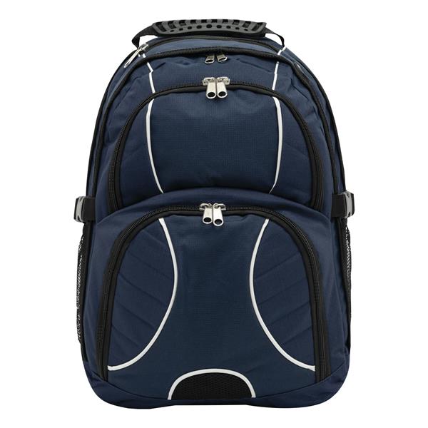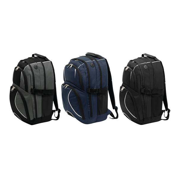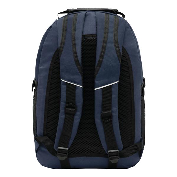 Plecak HYPE z dwiema przednimi kieszeniami zapinanymi na suwak, w tym jedna z mniejszymi kieszonkami w środku, dwie główne komory na suwak. Jedna usztywniana na laptopa, a druga na odtwarzacz CD lub inny sprzęt, z otworem na kabel słuchawek, jedna kieszeń na klucze, dwie kieszenie z siatki po bokach, z mocną rączką, wyściełanymi ramiączkami i wzmocnionym tyłem.