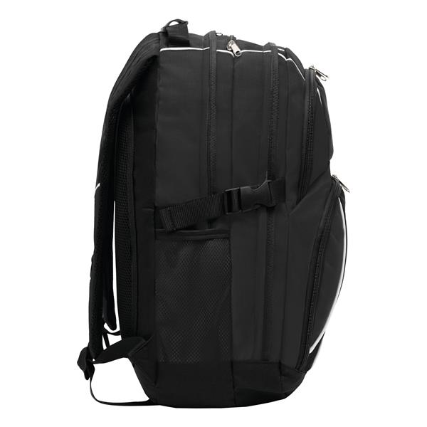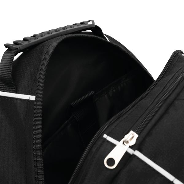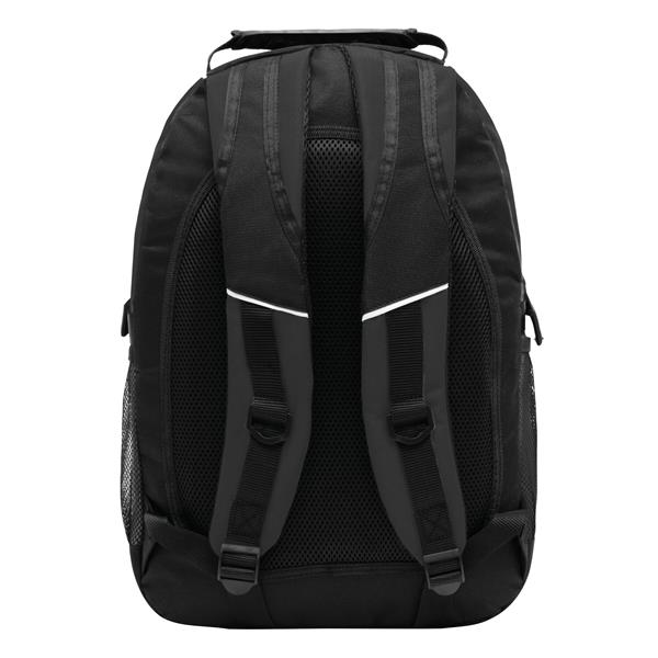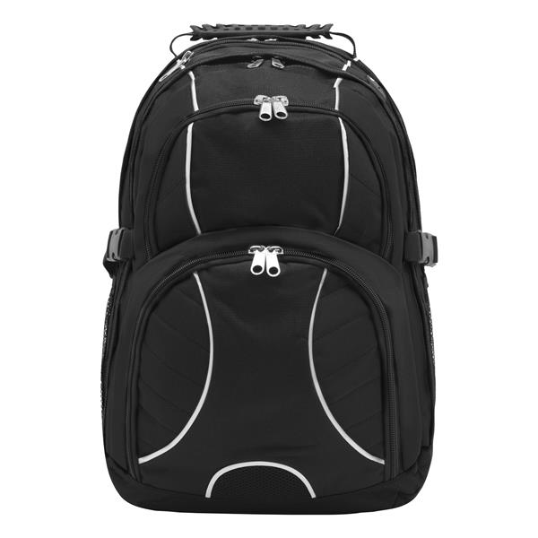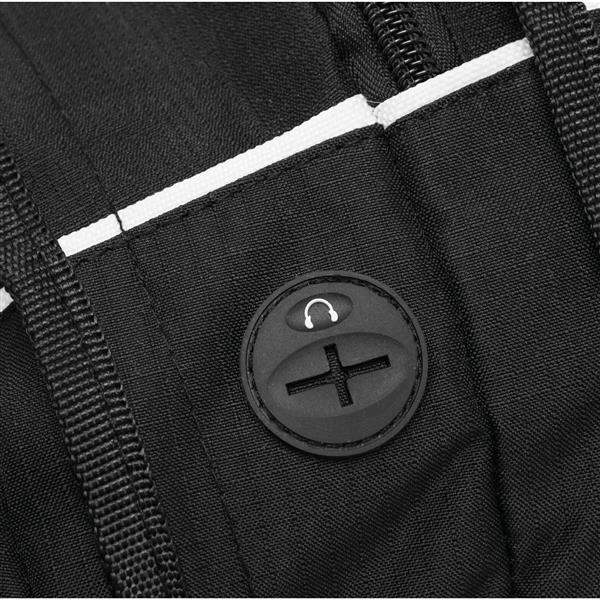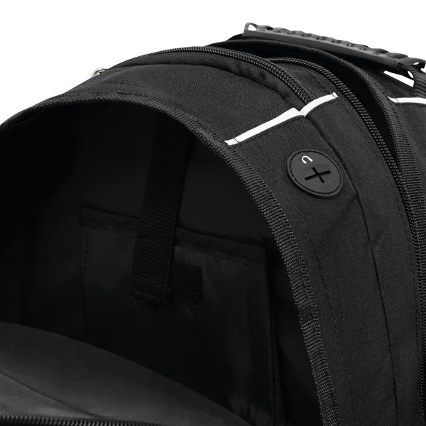 Plecak HYPE z dwiema przednimi kieszeniami zapinanymi na suwak, w tym jedna z mniejszymi kieszonkami w środku, dwie główne komory na suwak. Jedna usztywniana na laptopa, a druga na odtwarzacz CD lub inny sprzęt, z otworem na kabel słuchawek, jedna kieszeń na klucze, dwie kieszenie z siatki po bokach, z mocną rączką, wyściełanymi ramiączkami i wzmocnionym tyłem.