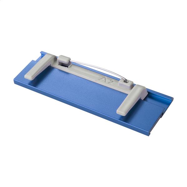 Aluminiowa przywieszka z wymiennymi papierowymi i plastikowymi elementami.