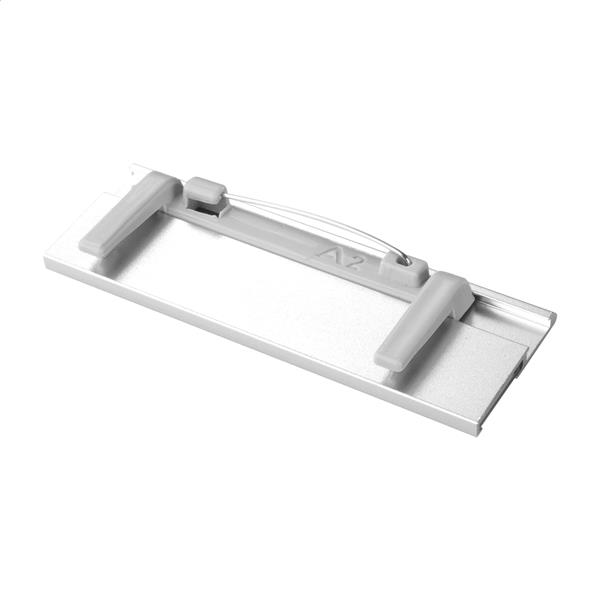 Aluminiowa przywieszka z wymiennymi papierowymi i plastikowymi elementami.