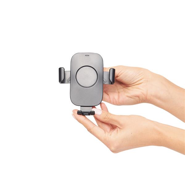 Uchwyt na telefon IN CAR z funkcją ładowania indukcyjnego. Do montażu na samochodowej kratce wentylacyjnej (pasuje do różnej grubości kratek). Przegub kulowy umożliwia optymalne ustawienie. Ładowarka z kablem USB o długości ok. 1 m.