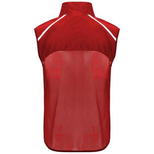Wiatroszczelny i oddychający. Zamek błyskawiczny z przodu z dopasowaną ochroną podbródka. Elastyczne wiązanie pod pachami i u dołu. Dolna część pleców z mikroperforowanego materiału. Dobrze widoczne detale na górze, z przodu i z tyłu. Kieszeń z elastycznym paskiem do przechowywania kamizelki i noszenia jej na nadgarstku. Usuwalna etykieta.