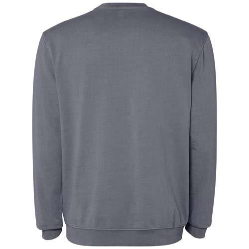 Sweter unisex z wykończeniem uzyskanym dzięki poddaniu działaniu wybielacza w celu uzyskania smug lub odbarwień. Prążkowany ściągacz 2×1 przy dekolcie, mankiety i dół w tym samym kolorze. Wzmocnione szwy przy mankietach, u dołu, w pasie i otworach na ręce. Ścieg kryty ton w ton przy dekolcie.