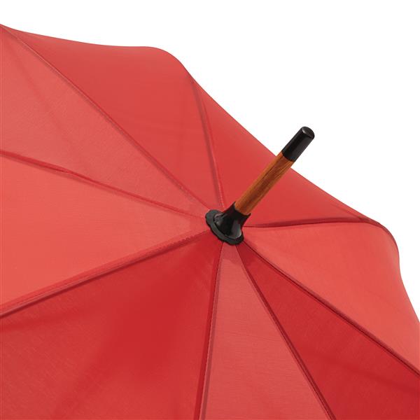 Automatyczny parasol JAZZ z poszyciem z poliestru wykonanego z tworzyw sztucznych pochodzących z recyklingu. Ma drewnianą laskę, szyny z włókna szklanego oraz drewniane kolce. Posiada zaokrąglony, drewniany uchwyt. Zapinany jest na rzep.