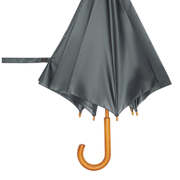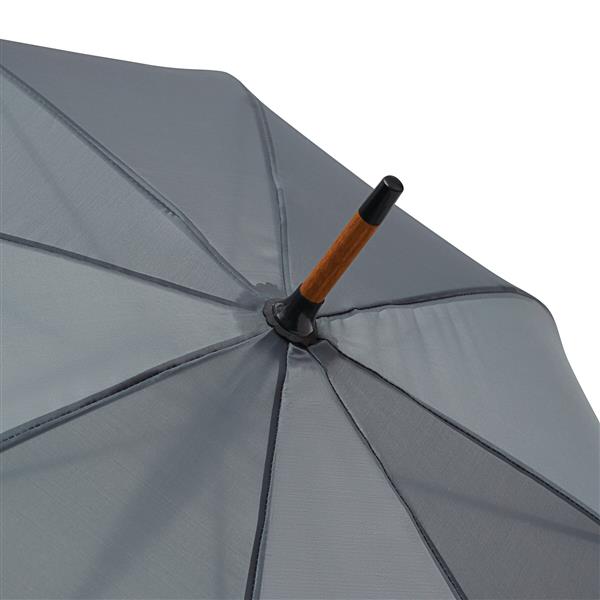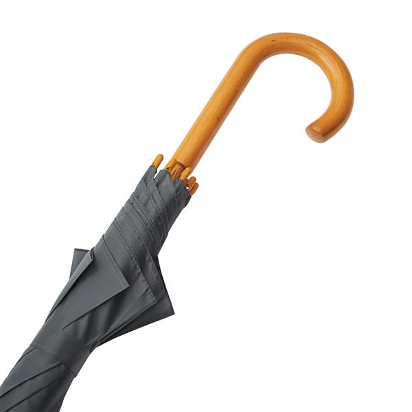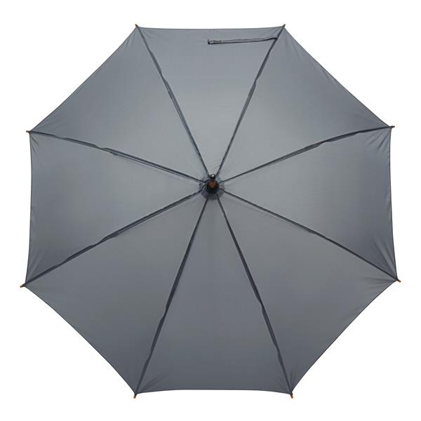 Automatyczny parasol JAZZ z poszyciem z poliestru wykonanego z tworzyw sztucznych pochodzących z recyklingu. Ma drewnianą laskę, szyny z włókna szklanego oraz drewniane kolce. Posiada zaokrąglony, drewniany uchwyt. Zapinany jest na rzep.